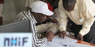 An NHIF official helps a customer fill membership forms. Self-employed workers will continue contributing Sh160 to the scheme until a case challenging the new rates is determined. PHOTO | FILE