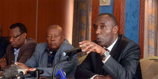 From left; Members of the Grain Mill Owners Association and Association of Kenya Feed Manufactures Patrick Mwangi, Peter Mwangi and Martin Kinoti during briefing in Nairobi June 3, 2019. PHOTO | SALATON NJAU | NMG