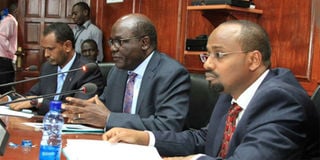 From left, IEBC commissioner Yusuf Guliye, chairman Wafula Chebukati and commissioner Molu Boya when they appeared before the National Assembly’s Justice and Legal Affairs Committee on May 3, 2018. PHOTO | JEFF ANGOTE