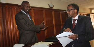 Lawyer Ahmednasir Abdullahi (right) cross-examines Treasury PS Kamau Thugge during the hearing of the Anglo Leasing case in Nairobi yesterday. PHOTO | PAUL WAWERU | NMG