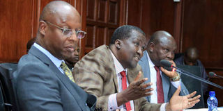 From left: Petroleum PS Andrew Kamau, CS John Munyes and chief administrative secretary John Mosonik when they appeared before National Assembly’s Parliamentary Investment Committee. PHOTO | JEFF ANGOTE | FILE