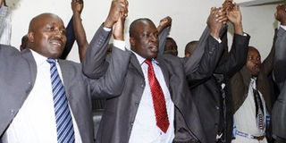 Secretary General of the Union of Kenya Civil Servants Tom Odege, (second left) during a press conference. The Union has sued the Health ministry, with claims the ministry is planning to divert contributions from its members starting this month to splinter unions. Photo/Stephen Mudiari