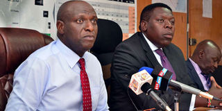 Energy Secretary Charles Keter at a media briefing in Nairobi May 15, 2018 on the impact of rising water levels in hydro dams. At right is Devolution Secretary Eugene Wamalwa. PHOTO | francis nderitu | NMG
