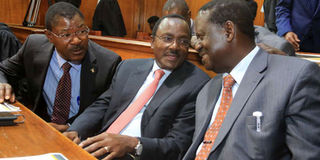 NASA leaders from left: Moses Wetangula, Kalonzo Musyoka and Raila Odinga at the Supreme Court on August 29, 2017. Photo | Jeff Angote | Nairobi
