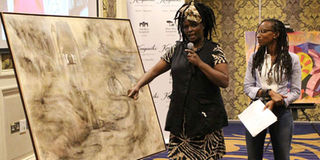 Artist Tabitha wa Thuku explains her art to Wasanii Jukwaani MC Wambui Collymore. PHOTO | MARGARETTA WA GACHERU | NMG