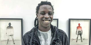 Onyis Martin with his painting ‘Same Men Behind. PHOTO | MARGARETTA WA GACHERU | NMG