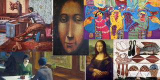Kenyan art. Elias Mung'ora (untitled painting (left top), Edward Hopper's Cop Suey painting (left bottom), Peter Elungat's Echoes of the Soul portrait, Leonard Da Vinci's Mona Lisa, Mohamed Rabies's The Feast painting (top right) and Egyptian art painted in 13th century BC