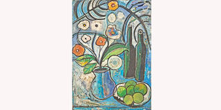 The same could be said for Kamal Shah’s ‘Village Diva in Red’ and John Kamicha’s untitled piece. All four of these paintings feel like they blend in well with the quality prevailing in the show as a whole. Even Robin Anderson’s oil on canvas painting is a discovery since she is best remembered for her lovely hand-painted silk batiks. But before she developed that popular style, Robin painted in oils on canvas which is what we’ll find at the auction.