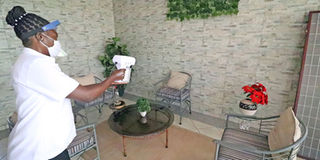 An Aromatics Spa staffer sanitising a relaxing area on Manyani East Road. PHOTO | DIANA NGILA | NMG
