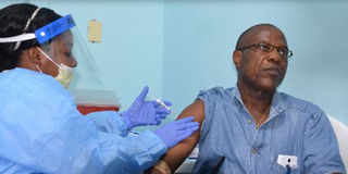 Dr Francis Kateh (right) volunteers to receive a trial vaccine against Ebola at Redemption Hospital on the outskirts of Monrovia, Liberia, in February. PHOTO | AFP