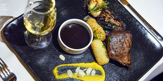 Double cut beef tenderloin, potatoes croquette, grilled asparagus, roasted almonds, carrot pure, dark chocolate-merlot sauce served with Talisker 10 years old at the Movenpick Hotel and Residences. PHOTO | DIANA NGILA | NAIROBI