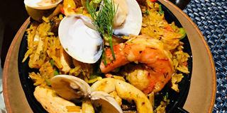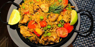 The seafood paella includes; calamari, prawns, chicken and fish. The fluffy yellow rice dish is a common find at Spanish restaurants in Nairobi.