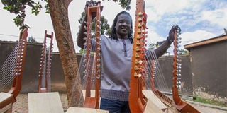 James Ssewakiryanga Jnr, a Ugandan Afro-fusion and folk musician, with the janzi music instrument he invented. PHOTO | COURTESY | NMG