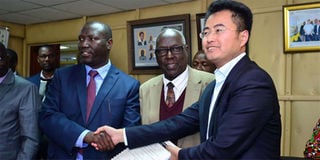 Kenya National Highways Authority director- general Peter Mundiria (left) and China State Construction Engineering Corporation Eastern African Region general manager Zhang Ruiping (right) exchange contract documents after signing an agreement for a road upgrade. FILE PHOTO | NMG
