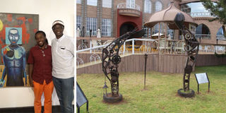 Founder Artist Waweru Gichuhi with his artwork and George Waititu at Tafaria inaugural exhibition (left). Maggie Otieno’s ‘‘Soul of Tafaria’’ sculpture at the entrance of Tafaria Castle (right). PHOTOS | MARGARETA WA GACHERU