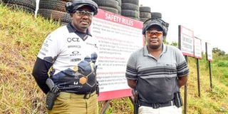 National Gun Owners Association, NGAO-Kenya chairman Anthony Wahome with Kenya’s top shooter (master) Eng Robert Nyamongo pose for a photo at the NGAO shooting range in Kirigiti, Kiambu County. PHOTO | DIANA NGILA | NMG