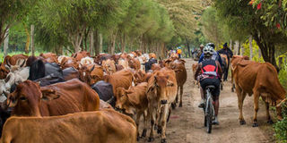Lake Naivasha Cyclists navigate around cattle on their way to Lake Naivasha. PHOTO | COURTESY