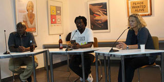 Kenya Pavilion panel (from left) Michael Soi, Jimmy Ogonga, Danda Jaroljmek during a meeting with artists at the Goethe Institute in Nairobi. RIGHT: Peterson Kamwathi (centre),one of Kenya Pavilion artists. PHOTO | MARGARETTA WA GACHERU | NMG