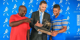 EABL Marketing and Innovation Director, Graham Villiers-Tuthill, with Dismas Indiza (left) and Greg Snow when he awarded them Sh3.2 million for their excellent performance through the Safari Tour. PHOTO | COURTESY