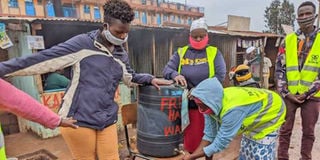 A hand- washing station in Ngando. Nairobi, Tazama Nia has developed a system of food vouchers to assist needy families, during the Covid-19 crisis. PHOTO | COURTESY