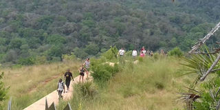 Tourists hike from the Sheldrick Falls along the 2.5kilometres footpath that takes about 45 minutes to walk. PHOTO | FADHILI FREDRICK | NMG