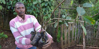 Joseph Gitonga tends to his grafted apple seedlings at his Miagayu-ini home in Nyeri. He sells each seedling at Sh500. Photo/Joseph Kanyi