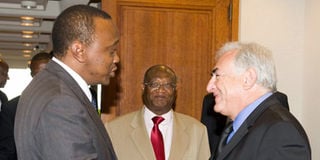 Deputy Prime Minister and Finance Minister, Mr Uhuru Kenyatta (left), shakes hands with International Monetary Fund (IMF) Managing Director, Mr Dominique Strauss-Kahn, at the conclusion of their meeting in Washington DC as IMF Executive Director, Mr Samuel Itam, looks on. /courtesy: IMF