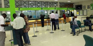 Customers wait to be served in a KCB banking hall . FILE PHOTO | NMG