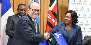 French Development Agency (AFD) Director General Rémy Rioux, Treasury CS Henry Rotich (back left), and KenGen Managing Director Rebecca Miano (2R) during the signing of a series of credit facility agreements between AFD, the Kenyan government and KenGen. PHOTO | DIANA NGILA | NMG