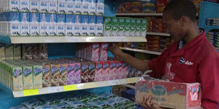 An attendant arranges packets of milk at Chieni Supermarket in Nyeri. PHOTO | JOSEPH KANYI