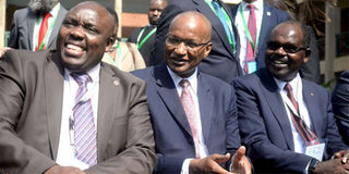 Credit Information Sharing Association of Kenya chairman Charles Ringera, CBK Governor Patrick Njoroge and bankers association CEO Habil Olaka at the credit sharing conference in Nairobi August 27, 2018. PHOTO | SALATON NJAU | NMG