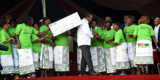 President Uhuru Kenyatta shakes hands with members of Kiambu Women Enterprise Fund after handing over a dummy cheque at Ndumberi Stadium in Kiambu County on December 5,2018. FILE PHOTO | NMG