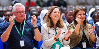 M-Pesa Foundation director Les Baillie (left), Airbus Foundation executive director Andrea Debbane (centre) and International director Hania Tabet during the launch of the Airbus Little Engineer Initiative at the M-Pesa Foundation Academy. PHOTO | COURTESY