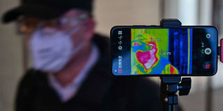 A man wearing a face mask has his temperature measured in a mall in the financial district of Lujiazui in Shanghai on March 4, 2020. PHOTO | HECTOR RETAMAL | AFP