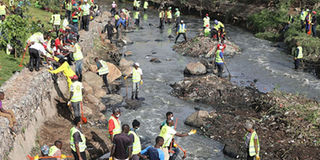 Nairobi county youth conduct a cleaning exercise in one of Nairobi rivers. Nairobi governor Mike Sonko announced the latest in a string of clean-up operations over the past two decades in May last year, however it began in earnest in early 2019. PHOTO | MIKE SONKO