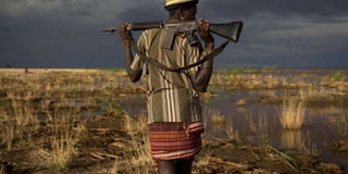 An armed man walks the shores of Lake Turkana, near a temporary fishing camp. FILE PHOTO | REUTERS