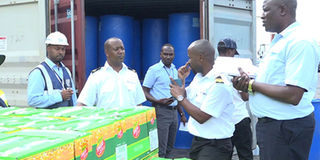 Members of the multi-agency team that conducted the verification exercise that revealed the smuggled ethanol and Range Rover SUV at the Mombasa port. PHOTO | COURTESY