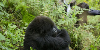 A female gorilla looks at a tourist at the Virunga National park in northern Rwanda: Kenya, Uganda and Rwanda will jointly market their tourism products online. FILE PHOTO | CYRIL NDEGEYA