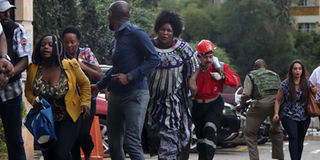 People run for their lives after they were rescued at Dusit Hotel which was under attack by suspected terrorists on January 15, 2019. PHOTO | JEFF ANGOTE | NMG