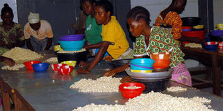 Cashewnut workers sorting cashewnuts in a factory in Kilifi county. PHOTO | LABAN WALLOGA
