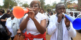 Nurses in Nyeri protests outside the County Government headquarters where they were seeking audience with governor Samuel Wamathai on May 8, 2017. PHOTO | JOSEPH KANYI | NMG