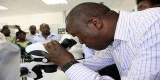 Fisheries principal secretary Prof Micheni Ntiba looks through the newly acquired microscopes at the fish lab on August 1, 2017. PHOTO | LABAN WALLOGA | NMG