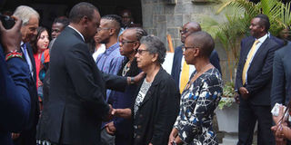 President Uhuru Kenyatta consoles Bob Collymore's mother next to Wambui Collymore (right) at the All Saints Cathedral during the memorial service, July 4, 2019. PHOTO | KANYIRI WAHITO | NMG