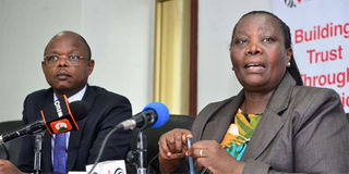Kenya Revenue Authority (KRA) Deputy Commissioner on Policy Caxton Musudi (left) and domestic taxes department commissioner Elizabeth Meyo during a media briefing on the on implementation of EGMS on November 8, 2019. PHOTO | SALATON NJAU | NMG