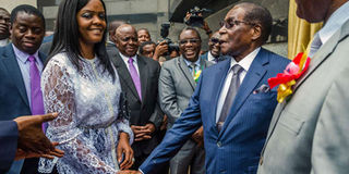 Zimbabwean President Robert Mugabe (right) is congratulated by First Lady Grace Mugabe after he unveiled a plaque at the country's main international airport in Harare, Zimbabwe, renamed after him on November 9, 2017. AFP PHOTO | JEKESAI NJIKIZANA
