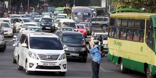 A policeman controls traffic on Kenyatta Avenue, Nairobi on July 8. If the NMS plan pans out, matatus will not access the city centre from November. PHOTO | DENNIS ONSONGO | NMG