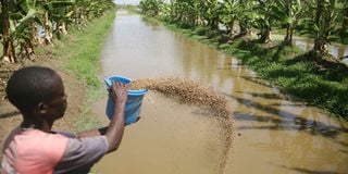 A worker at the Dominion in Siaya feeds fingerlings at a fish pond within the extensive farm. The farm also reared fish for sale. FILE PHOTO | HEZRON NJOROGE | NMG