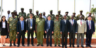 Uganda's National Enterprise Corporation managing director, Maj Gen James Mugira (5th L) and the Chancellor of Shijiazhuang, Prof Wang Yuesen (6th R) Tiedao University pose with graduates for a group photo. PHOTO | COURTESY | DAILY MONITOR