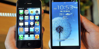 In this file photo taken on August 26, 2012, an employee shows an Apple's iPhone 4s (L) and a Samsung's Galaxy S3 (R) at a mobile phone shop in Seoul. FILE PHOTO | AFP