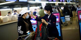 An employee of Japan Airlines (JAL), wearing protective mask following an outbreak of the coronavirus disease (COVID-19), scans the temperature to a passenger at the almost empty Kansai International Airport in Osaka, Japan, March 14, 2020. PHOTO | REUTERS